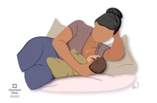 Gece emzirmelerinde ya da anne dinlenmek istediğinde tercih edilen bir yöntemdir. Anne ve bebek karın karına yatarken, boşta kalan el ile bebeğin başı desteklenir. Bu pozisyon aşırı süt üretimi olan anneler için özellikle faydalıdır çünkü güçlü süt akışını biraz yavaşlattığı biliniyor. Ancak emzirme sırasında annenin uyanık kalması önemlidir.