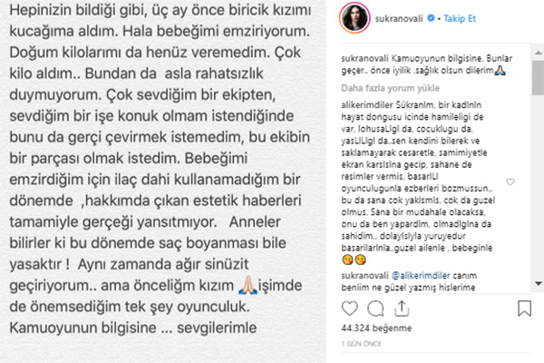 ‘Hepinizin bildiği gibi, 3 ay önce biricik kızımı kucağıma aldım. Bebeğimi emziriyorum. Doğum kilolarımı da henüz veremedim. Çok kilo aldım ancak bundan asla rahatsızlık duymuyorum. Çok sevdiğim bir ekipten, sevdiğim bir proje ye konuk olmam istendiğinde geri çevirmedim ve bu ekibin bir parçası olmak istedim. Bebeğimi emzirdiğim şu dönemde ilaç dahi kullanamıyorken, hakkımda çıkan estetik haberleri gerçeği yansıtmıyor. Anneler bilirler ki bu dönemde saç boyamak bile yasak! Ayrıca ağır bir sinüzit geçiriyorum. Ama önceliğim kızım, işimde önemsediğim şey ise oyunculuk. Kamuoyunun bilgisine, sevgilerimle…’